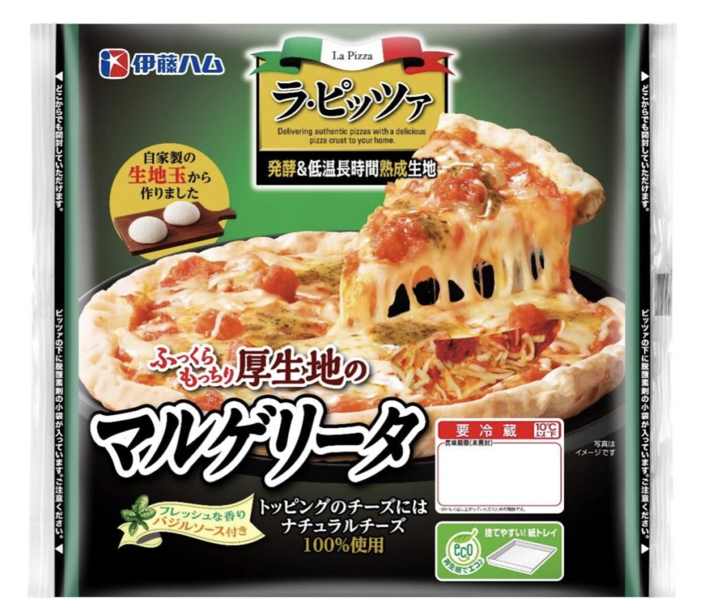 伊藤ハム『ラ・ピッツァ マルゲリータ』は、エクストラバージンオリーブオイルを生地に配合し、自慢の熟成生地を美味しく仕上げたふっくらもっちり厚生地のマルゲリータです。