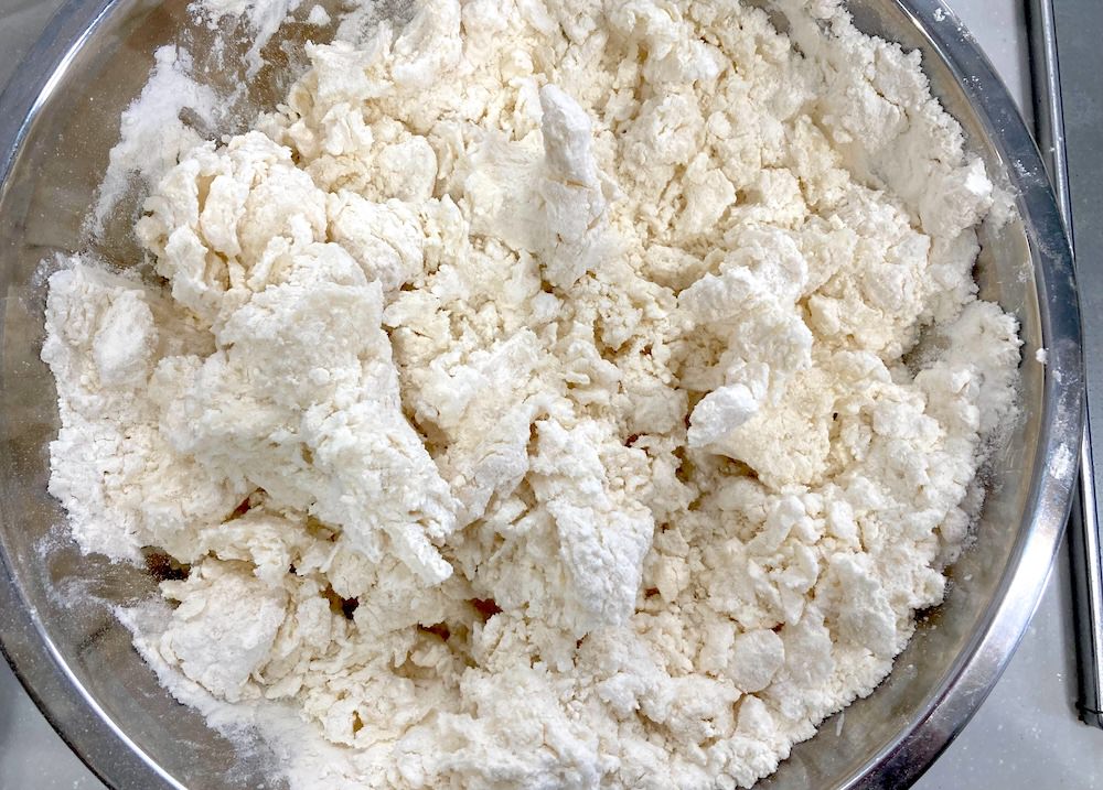 ① ボウルに粉類と塩を入れて混ぜたら、お湯を注ぎ入れて水回しをする。