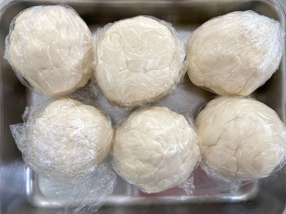 ③生地を6分割し、それぞれラップで包んだら冷蔵庫でねかせる。