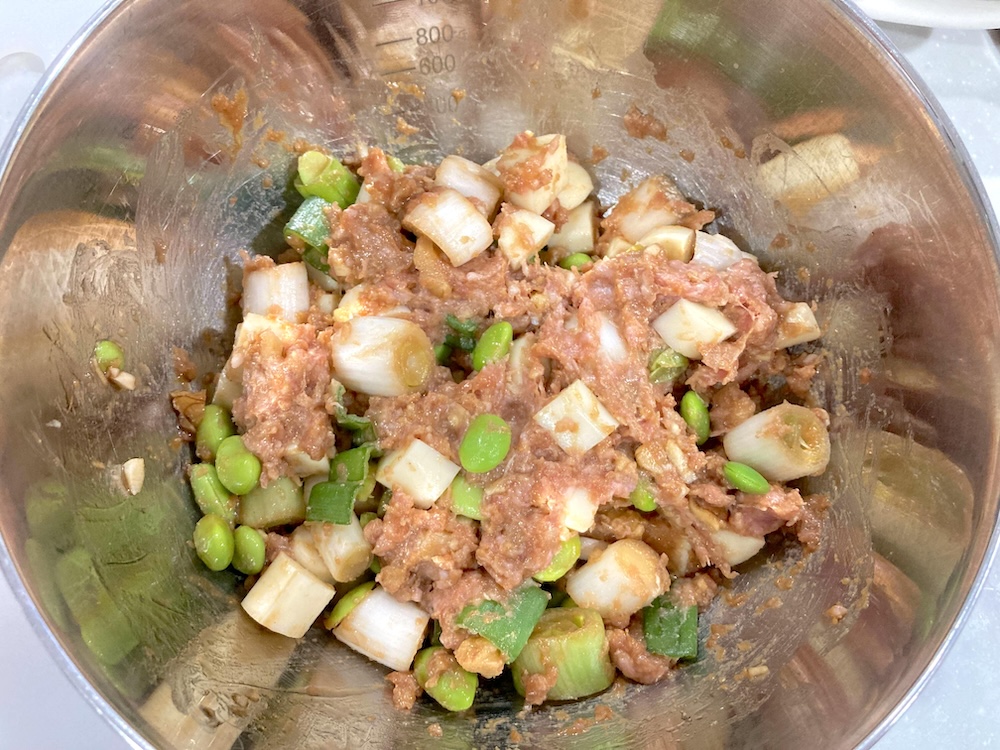 群馬県産の豚ひき肉と豚ブロック肉を両方組み合わせて旨味を出し、こんにゃくと枝豆で歯ごたえを出しています。
