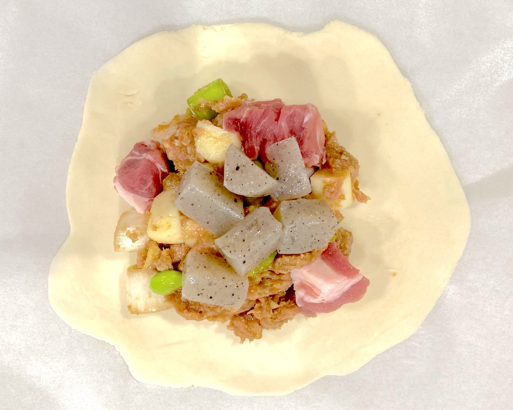 ①皮は丸く薄くのばし、その上に肉種をのせ、肉種の上にこんにゃくをまんべんなくのせる。