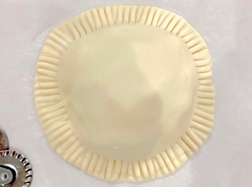 ③密着させた部分にフォークで1周飾り線をつけ、余分な皮をピザカッター(または包丁)でカットする。