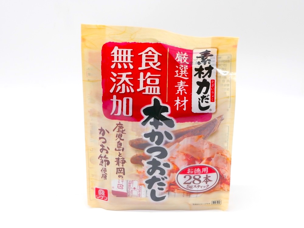 『素材力だし 本かつおだし 28本』は、理研ビタミン株式会社が手掛けるだしシリーズの一つです。