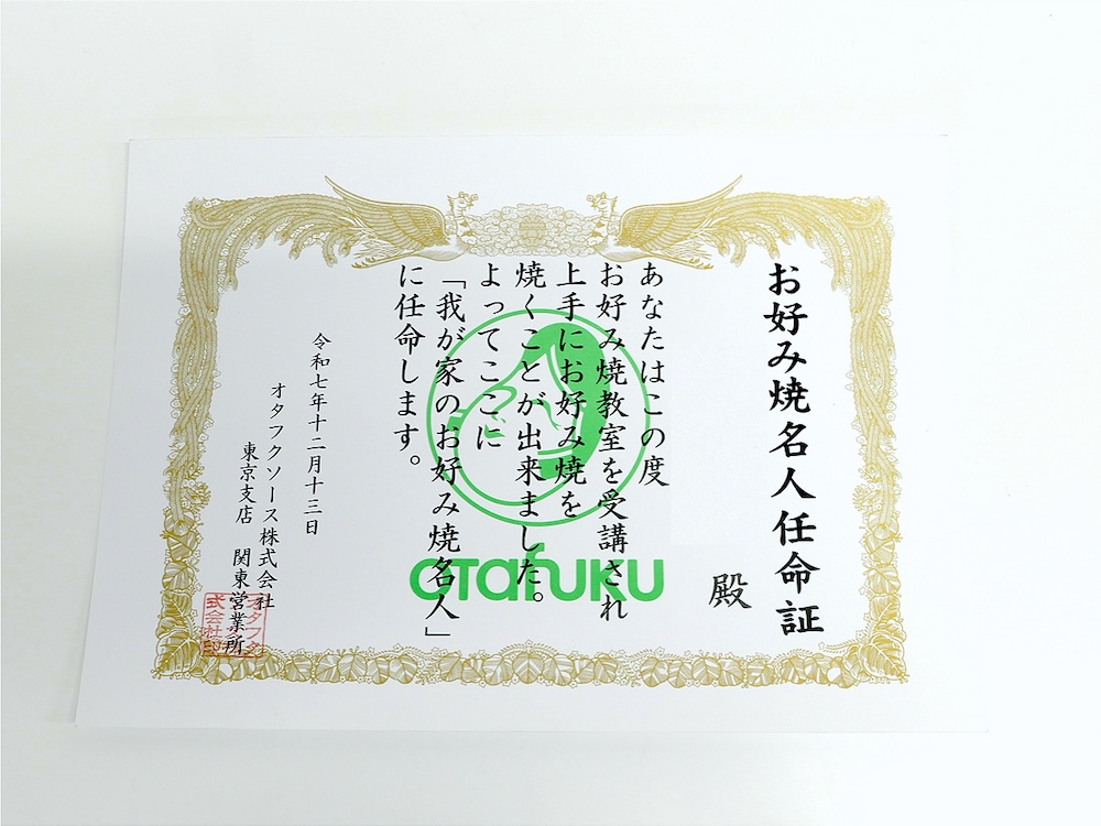 お好み焼教室の最後は、小笠原先生より子どもたち全員へ「お好み焼名人任命証」を授与していただきました。