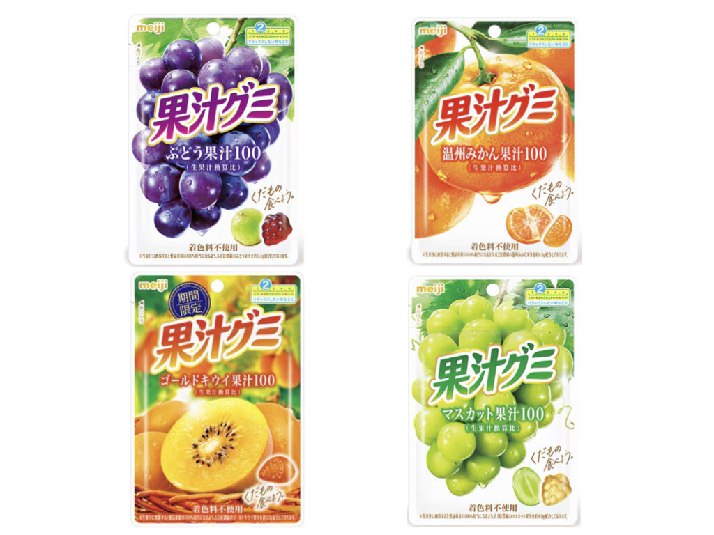 明治「果汁グミ シリーズ」の『ぶどう・温州みかん・ゴールドキウイ・マスカット』