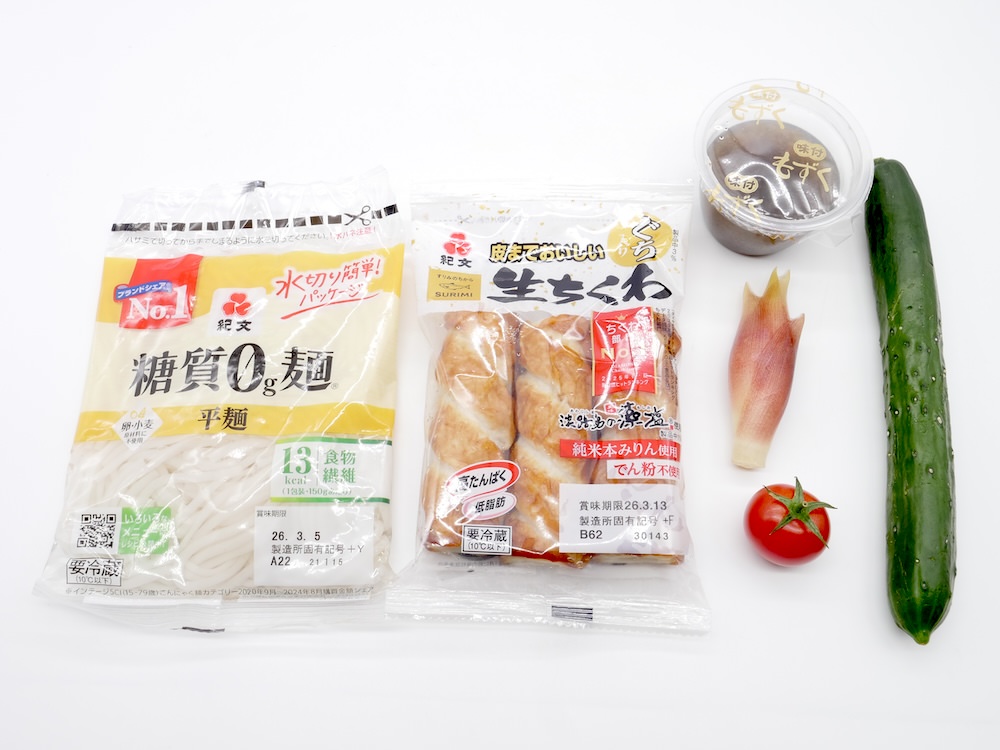 『皮までおいしい 生ちくわ』で「糖質0g麺のもずく酢あえ」を作ってみた!