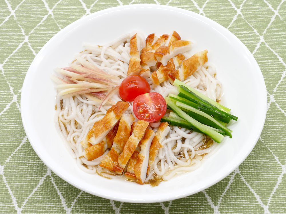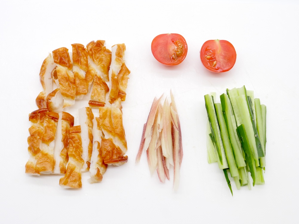 ②ちくわは長さを半分、縦半分にし、棒状に切る。きゅうり、みょうがは千切りにする。ミニトマトは半分に切る。