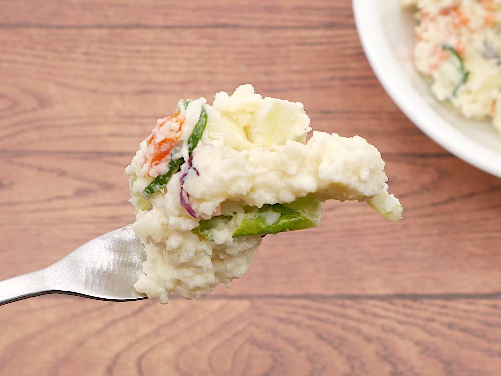 そして驚くのは食感。レタス・きゅうり・キャベツの“シャキッ”とした歯応えがしっかりと感じられ、「ポテトサラダなのに?」 と思うほどの軽やかさです!