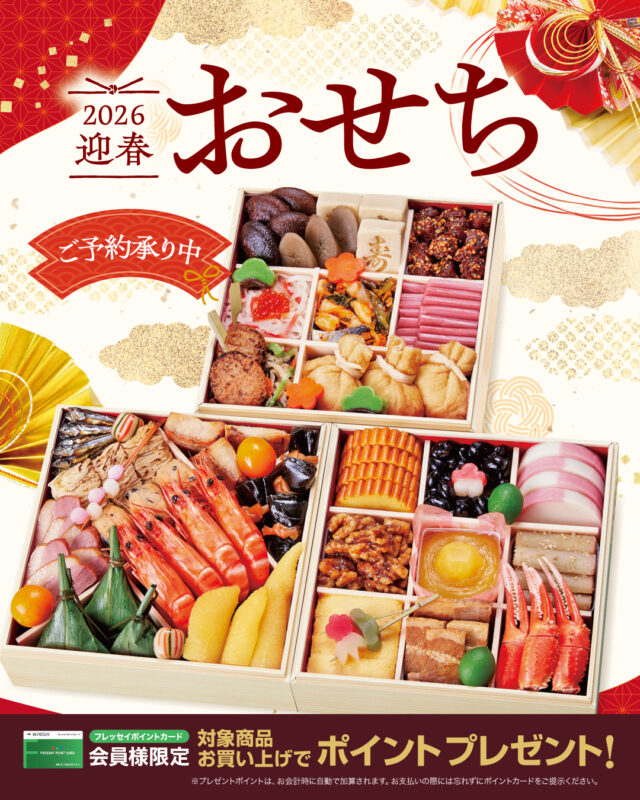 HOME新着情報【おせち】ご予約承り中!! 新着情報 お知らせ 2025.10.10 【おせち】ご予約承り中!! 今年も各店舗にておせちのご予約を開始しております。ご予約購入でボーナスポイントゲット♪♪店頭からご予約ください。 ※商品によってご予約締切日・お届け日が異なります。※一部商品はWEBからご予約いただけます。 パンフレットはこちらから 簡単ネット注文はこちらから 前の記事 一覧に戻る