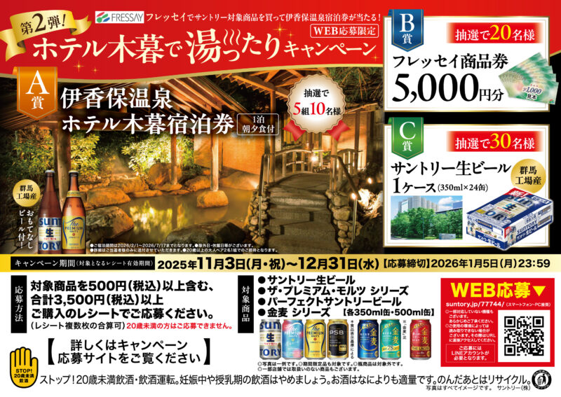 フレッセイでサントリー対象商品を買って 伊香保温泉宿泊券が当たる!