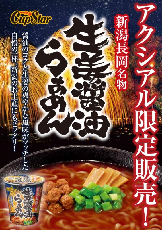 HOME新着情報アクシアル限定販売 新潟長岡名物「生姜醤油らぁめん」 新着情報 お知らせ 2025.11.08 アクシアル限定販売 新潟長岡名物「生姜醤油らぁめん」 サッポロ一番 Cup Star新潟長岡名物「生姜醤油らぁめん」アクシアル限定販売!〈数量限定〉 ●醤油のコクと生姜の爽やかな風味がマッチした自慢の一杯●生姜の香りでじんわりとあたたまる、冬にぴったりな商品●サンヨー食品前橋工場で作られた、ここでしか買えない特別な一杯です 前の記事 一覧に戻る