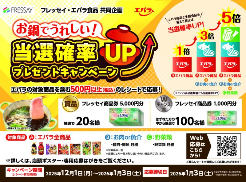 フレッセイ・エバラ食品 お鍋でうれしい!「当選確率UPプレゼントキャンペーン」