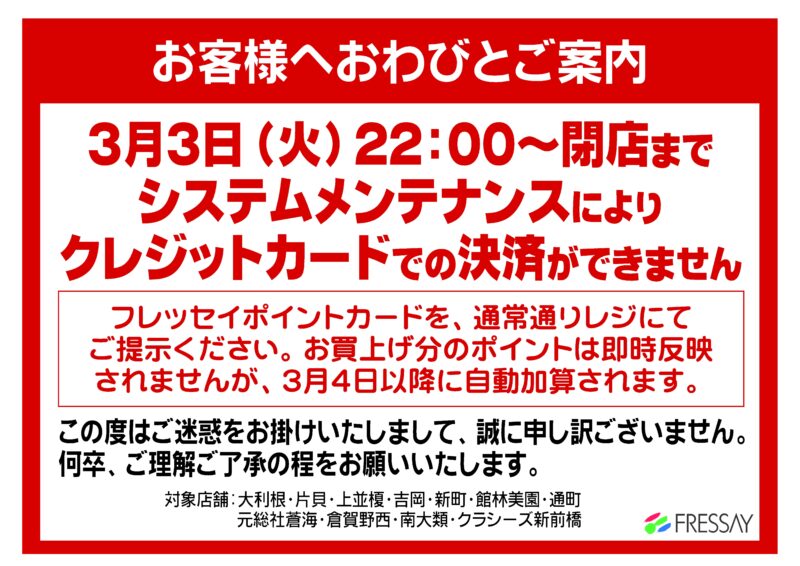 3月3日(火)22:00~閉店までシステムメンテナンスにより、クレジットカードでの決済ができません。