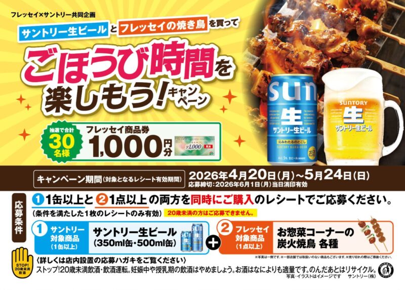 サントリー生ビールとフレッセイの焼き鳥を買って「ごほうび時間を楽しもう!」キャンペーン